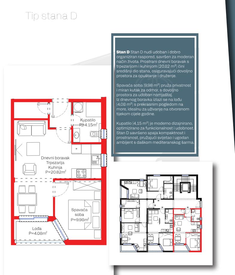 Novogradnja Drvenik, Makarska rivijera, Jednosoban stan u manjem stambenom objektu koji se sastoji od podrumske etaže gdje su smještena garažna mjesta, prizemlja i tri kata. U objektu se nalazi 16 jednosobnih stambenih jedinica. Stanovi numerirani oznakom D se nalaze u jugoistočnom dijelu objekta, jugoistočno su pozicionirani i svi imaju otvoren pogled na more. Stanovi su površine 42,00m2 te se sastoje od dnevnog boravka s kuhinjom i blagovaonicom površine 20,82m2, spavaće sobe površine 9,98m2, kupaonice površine 4,15m2, ostave površine 2,10,2 te lođe površine 4,08m2.