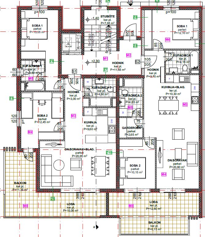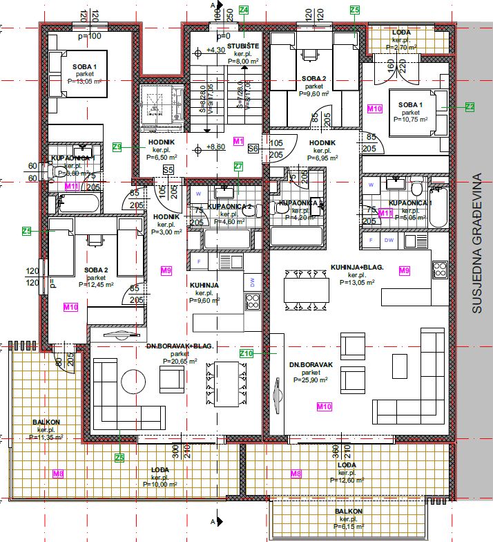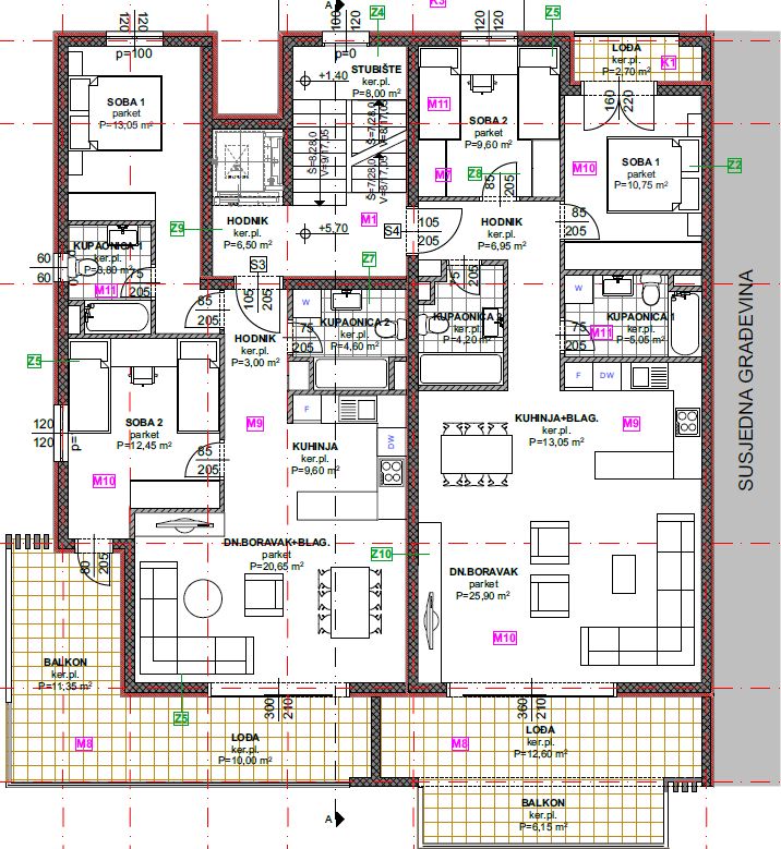 Dvosobni stanovi u manjem stambenom objektu u Zadarskoj ulici u Makarskoj, čija je gradnja započela u 12. mjesecu 2025. godine. Stanovi su južno orijentirani te su ukupne stambene površine 80,32m i 81,35m2. Stanovi će se sastojati od hodnika, dvije prostrane spavaće sobe, dvije kupaonice, kuhinje s blagovaonicom te dnevnog boravka s izlazom na južnu lođu i balkon površine 22,35 za stan od 80,32m2 i površine 19,75m2 za stan od 81,35m2. Sam objekt se gradi po najvišim stadardima dok če se u opremanju koristiti materijali i oprema renomitanih proizvođača. Završetak gradnje se očekuje do 01.12.2026. godine
