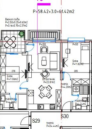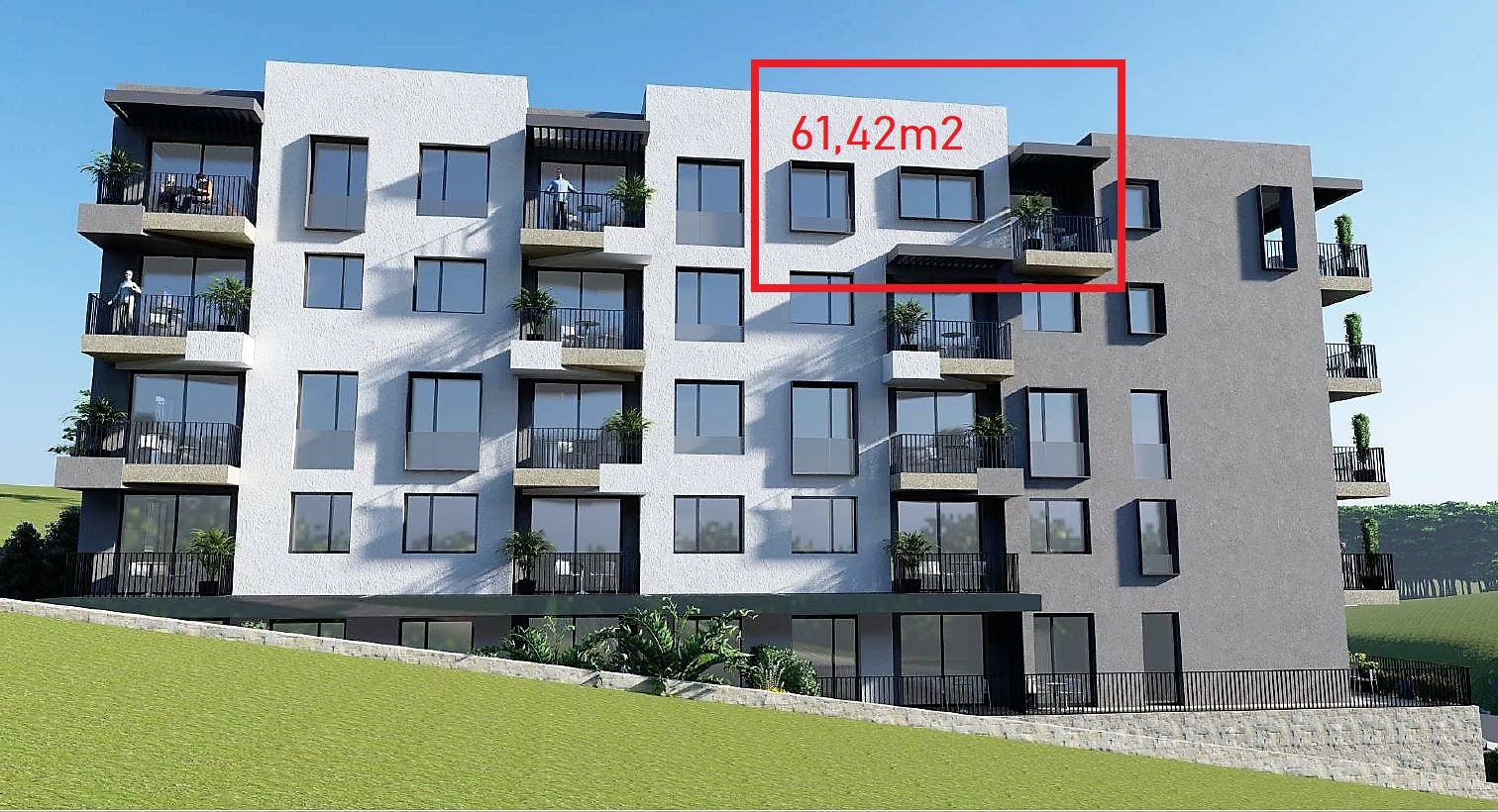 Dvosoban stan smješten na na 4. katu stambene zgrade u izgradnji, Zadarska ulica, Makarska. Stan je oznake S30, ukupne površine 61,42m2 u naravi se sastoji od hodnika, dvije spavaće sobe, kupaonice, kuhinje i blagovaonice, dnevnog boravka, balkona površine 5,66m2 . Zgrada je u finalnoj fazi gradnje . Zgrada s liftom se gradi po najvišim standardima, stanovi su opremljeni parketima, keramikom, sanitarijom, klima uređajem, unutarnjom stolarijom, vanjskim otvorima, sat tv priključak, blindo vrata. Stanu pripada i garažno mjesto.